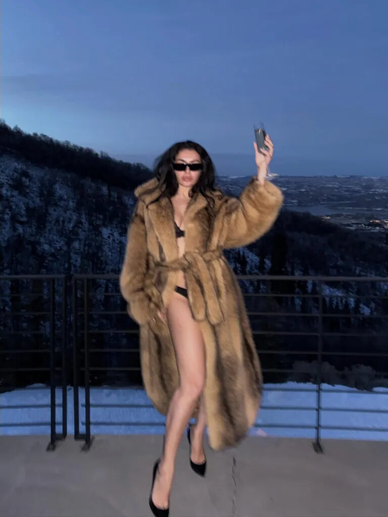 Вона опублікувала в Instagram серію своїх фотографій у бежево-чорній хутряній шубі, залишаючи мало місця для уяви.
